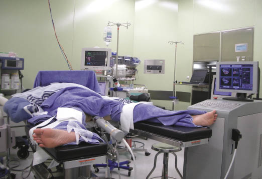 2) The ultrasound HIFU probe, covered with a condom, through which there is a continuous circulation of “chilled, degassed” water that has been prepared by the technologist, is gently inserted into the rectum and fixed to the stepper (the three-direction-adjustable ultrasound probe holder that is attached to the table).