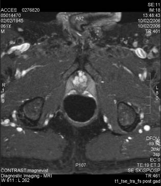 1) The rectum is dilated to a width of two fingers using some ultrasound jelly, and at the same time the physician checks to ensure that the rectum is empty of stool and mucous. If anything is found, saline irrigation is performed until the rectum is clear.