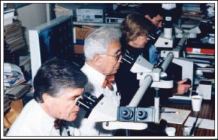 Dr. Mostofi (center left) and Dr. Sesterhenn (center right) teaching at the AFIP, circa 1985. The other two physicians are identified as Dr. Davidson and Dr. Wagner, both uroradiologists.